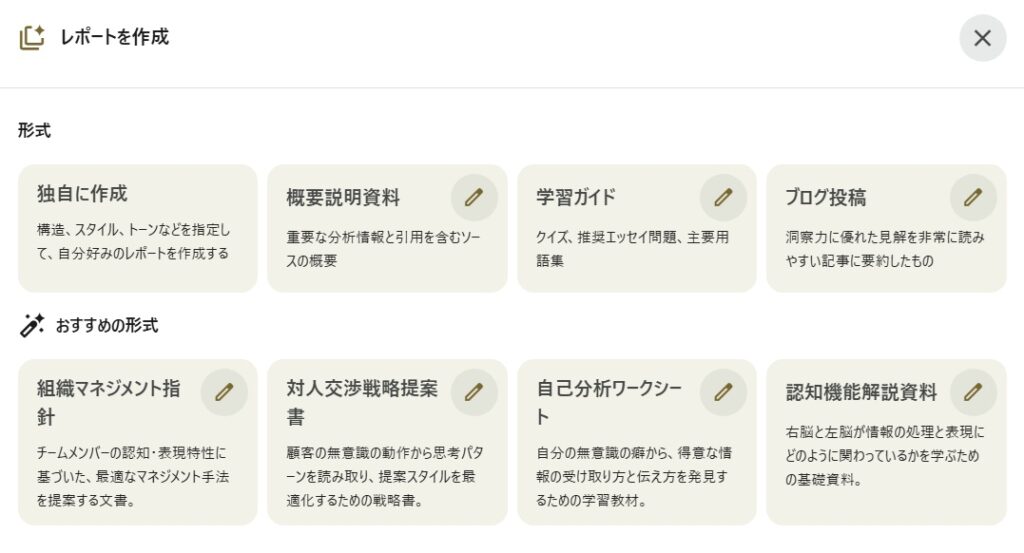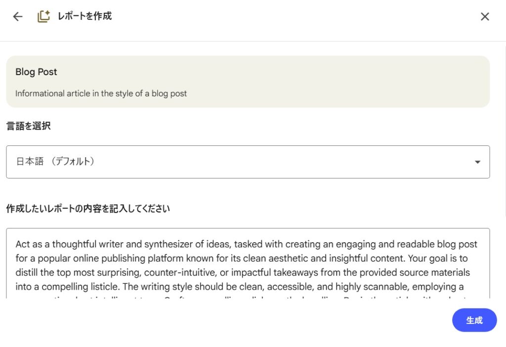 「レポート」はさまざまな形式を選択することができます。ここでは「ブログ投稿」を選択してみました。