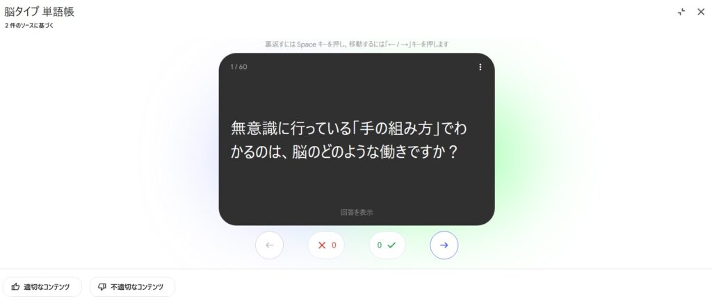「フラッシュカード」は単語帳が次々に表示されます。1/60とあるように60個あります。