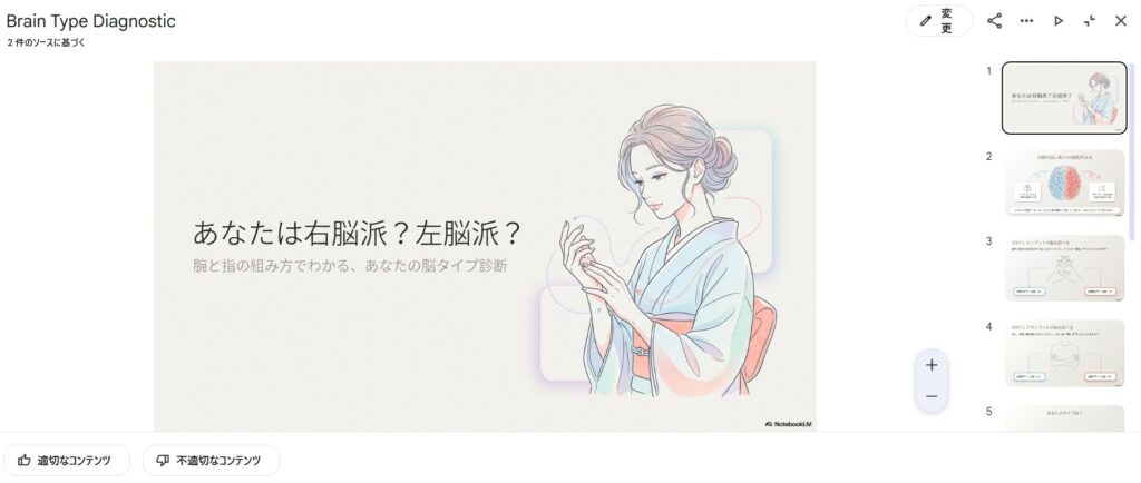 その後、間違えてまた「スライド資料」をクリックしてしまったら、微妙に違うスライドができました。NotebookLMでやっかいなところは、項目をクリックするとキャンセルできないところ。利用回数に上限があるものだと困る!